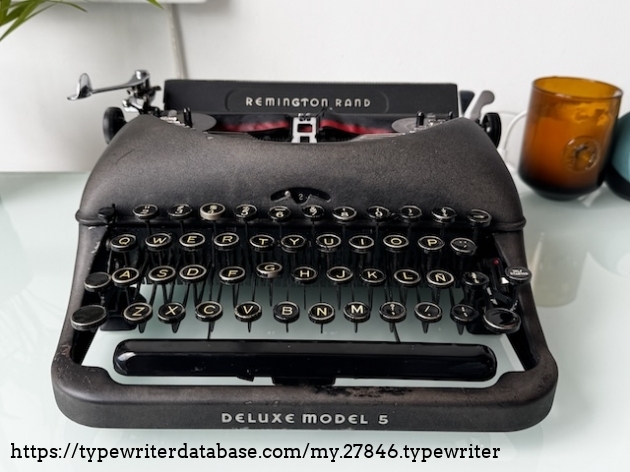 This Remington Rand Deluxe Model 5 is a compact and visually disciplined American portable, finished in textured black with glass-topped keys, dark key rings, and the characteristic raised paper table. It retains its original Spanish-language keyboard layout, including the Ñ, which gives it added regional interest from a collector’s standpoint.