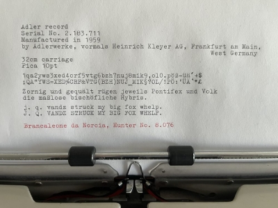 Fellow typospherians, may I introduce myself? I'm Brancaleone da Norcia, Typewriter Hunter and TWDB Patron from Germany. My main focus is collecting portable machines from the 1950s to the 1970s. I particularly appreciate good industrial design and durable construction. Many Olivetti models inspire my enthusiasm. I'm pretty good at touch typing, enjoying it a lot – it's very contemplative. At last, I have a particular fondness for pangrams and am always happy to discover new ones. Looking forward to get in touch with you, kind regards, Brancaleone.
