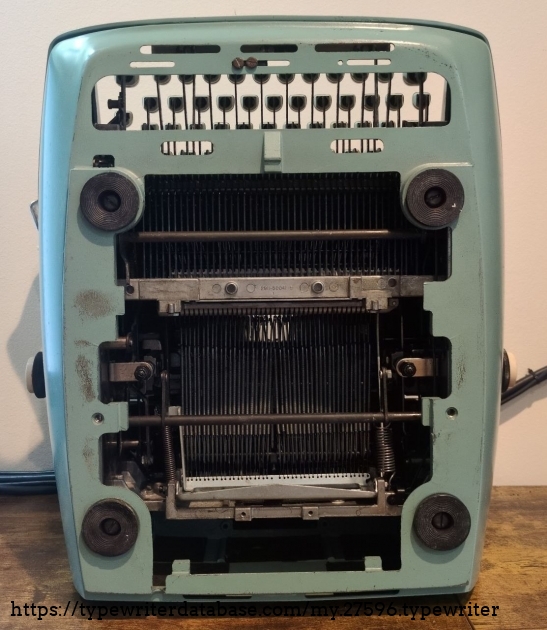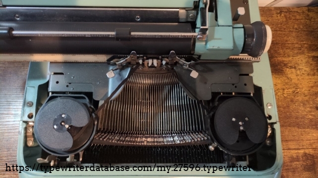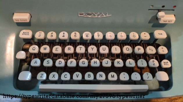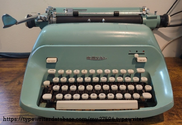 A lovely example in Aztec Blue. It is being listed as not in my collection because it will be given to a friend shortly after posting it here. As you can see from the typeface example this machine has a bit of damage to one of the serifs on the lowercase "m". I am not a fan of the plastic ribbon spool holders in these later Royals. The carriage return handle was swapped for one from a 440.