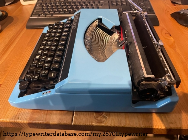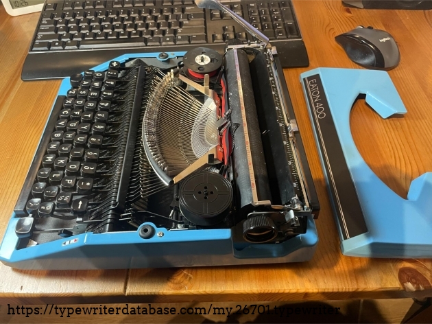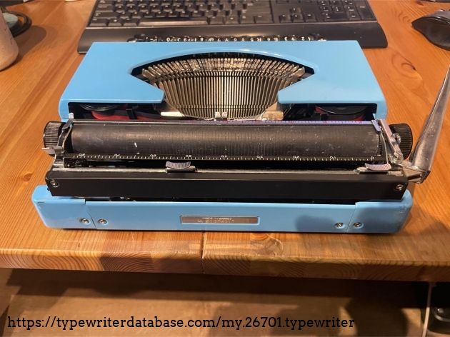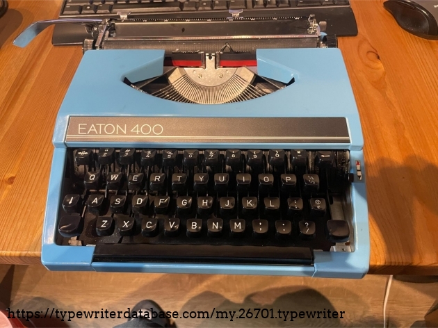 Eaton 400 purchased for 10cad in Toronto, Canada. For portable use in a car. Perfect paint condition, carriage came stuck but loosened up with 3 drops of break-kleen. Boring typeface for typing out forms on the fly. Also the @ and the 1/2 bar are bent, I have to file them thin to make them work correctly.