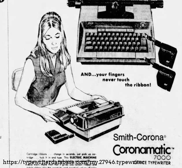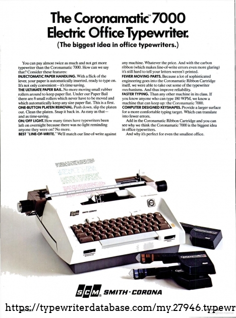 RESEARCH NOTE: When researching the Smith Corona Coronamatic 7000 on a computer with lots of screen real estate, you may find that launching the Smith Corona Serial Number page and the Smith Corona Coronamatic 7000 By Model/Year/Serial page in new browser windows can give you interesting perspectives on changes throughout the model series.