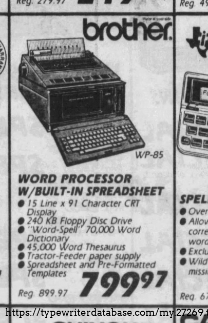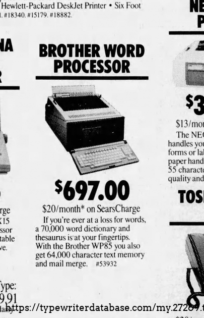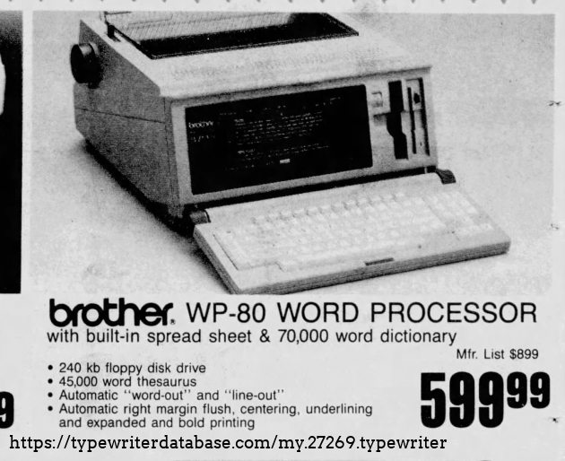 RESEARCH NOTE: When researching the Brother WP-85 on a computer with lots of screen real estate, you may find that launching the Brother Serial Number page and the Brother WP-85 By Model/Year/Serial page in new browser windows can give you interesting perspectives on changes throughout the model series.